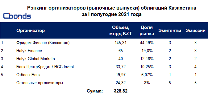 Рэнкинг организаторов облигаций Казахстана по итогам I полугодия 2021 года