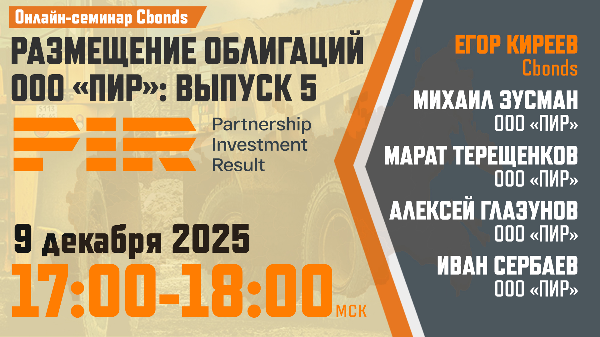 9 декабря в 17:00 (мск): онлайн-семинар Cbonds «Размещение облигаций ООО «ПИР»: выпуск 5»