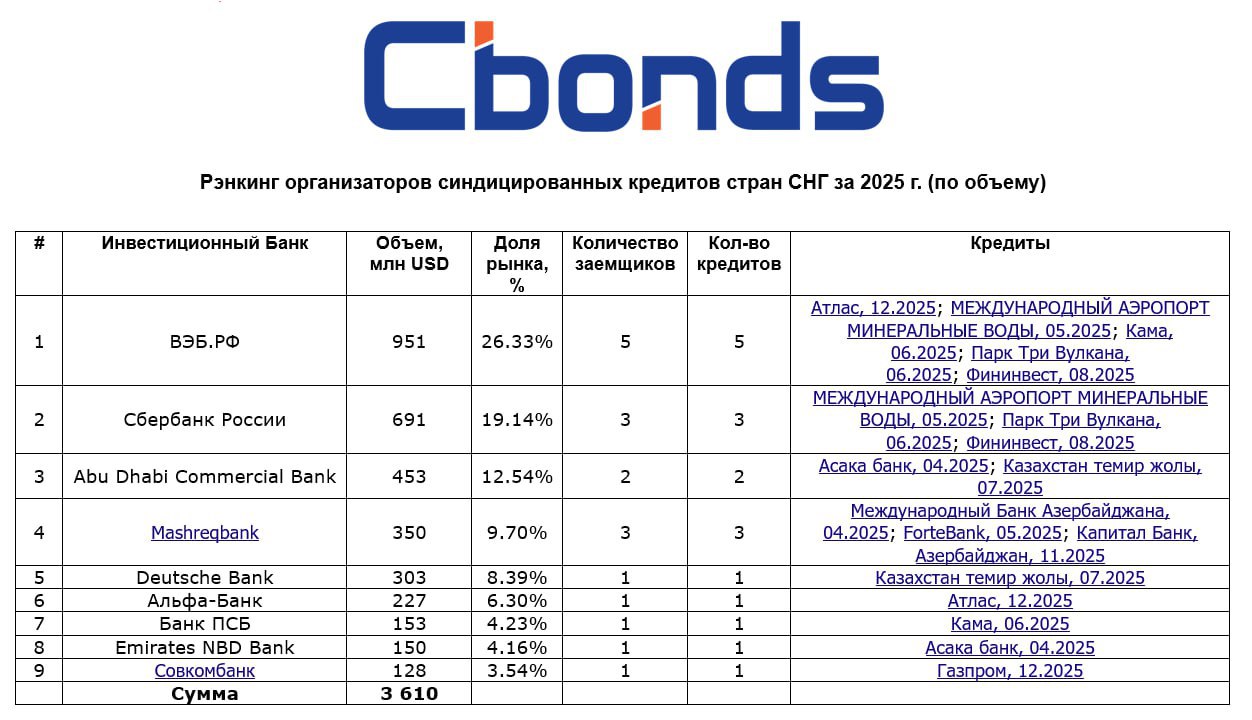 Рэнкинг организаторов синдицированных кредитов стран СНГ по итогам 2025 года