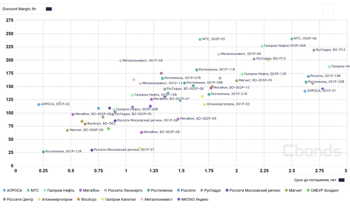 Распределение Discount Margin по эмитентам сегмента AAA — по мере увеличения срока до погашения маржа к ключевой ставке возрастает