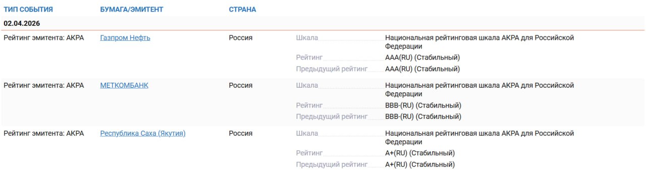 Рейтинги эмитентов в календаре событий доступны на сайте Cbonds